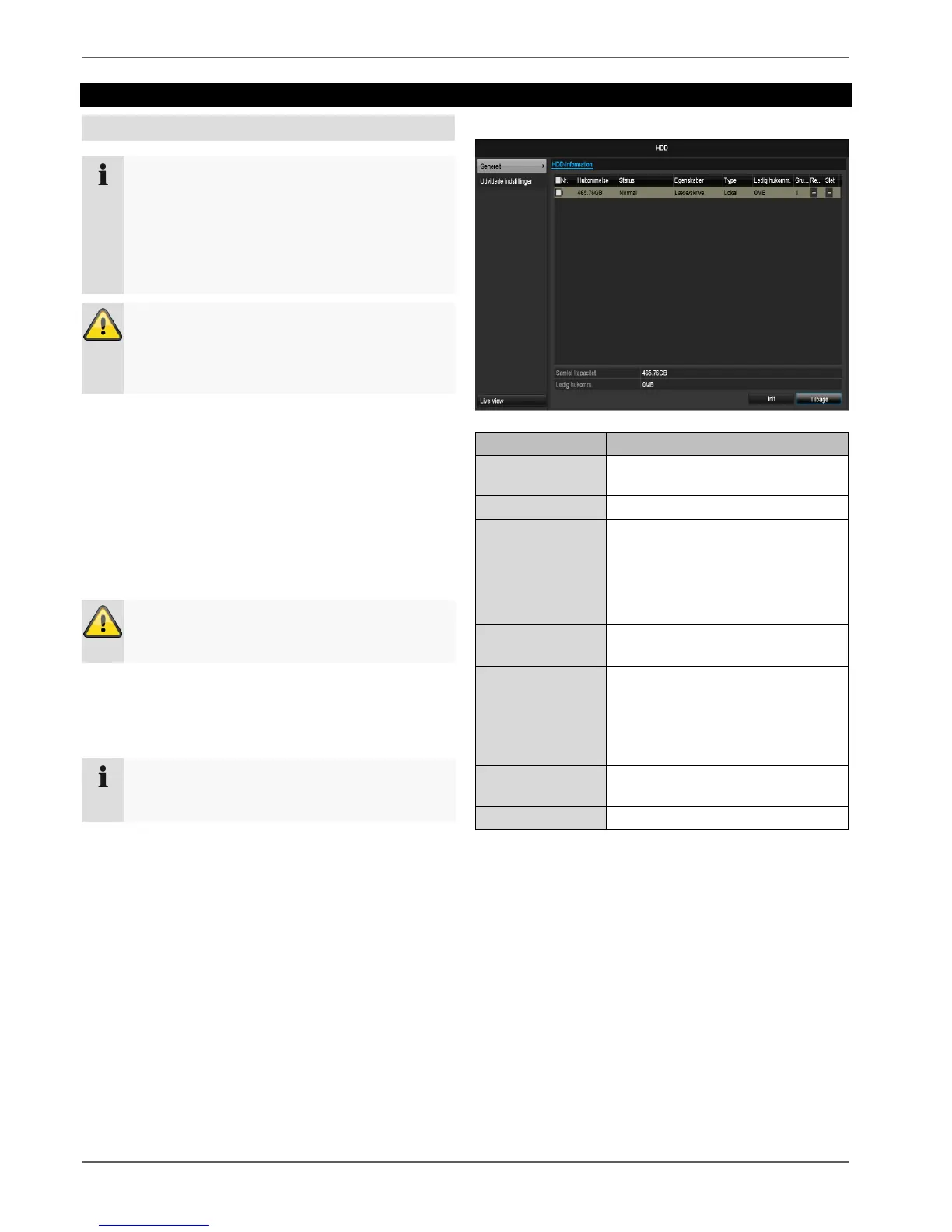 Klik i menuen på „HDD“ for at foretage indstillingerne