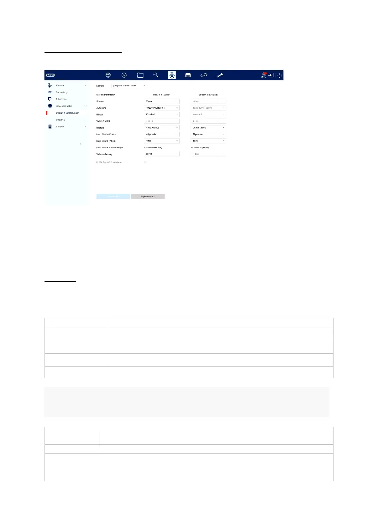 Hier können Sie die Video-Parameter für den Stream 1 und 2 anpassen.