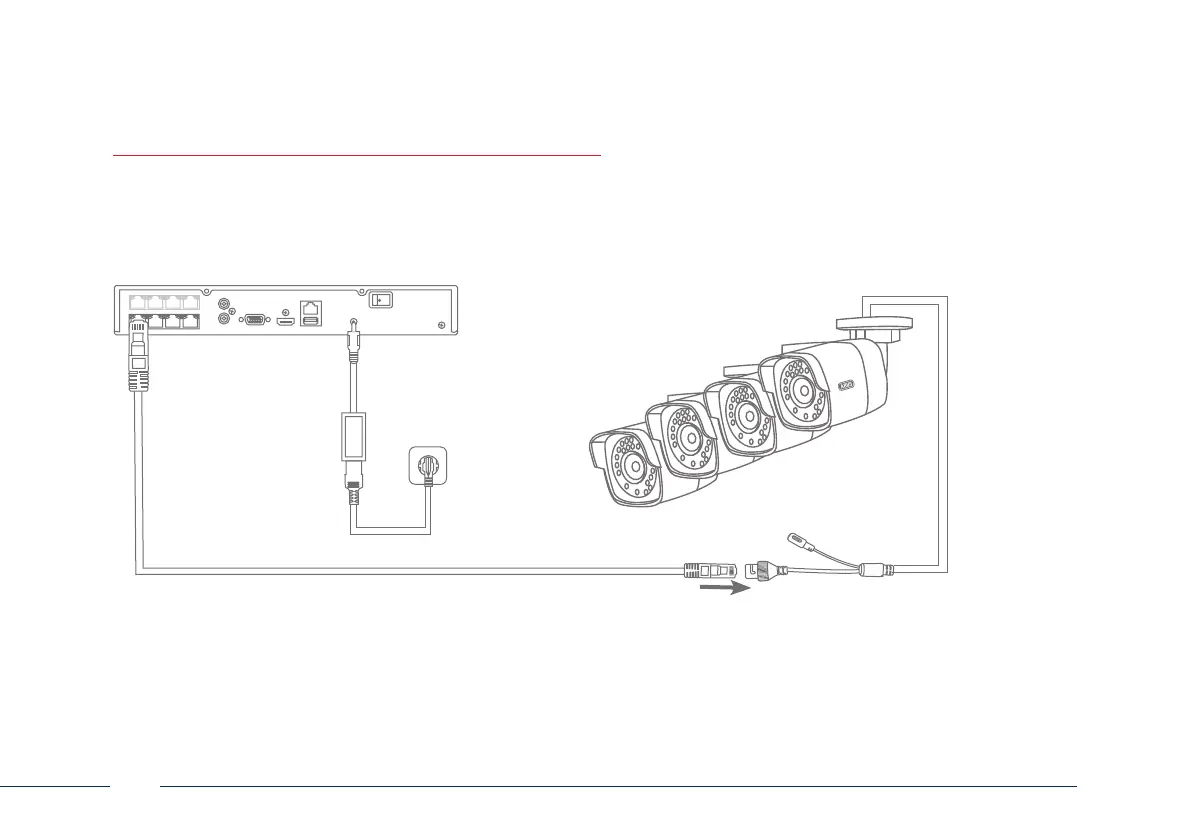 Suministre tensión a la grabadora. Conecte las cámaras a los puertos PoE de la grabadora mediante cable de red.