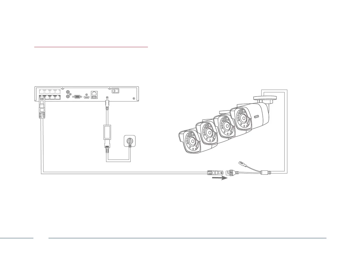 Connect the recorder to the power supply. Connect the cameras to the recorder’s PoE port using a network cable.