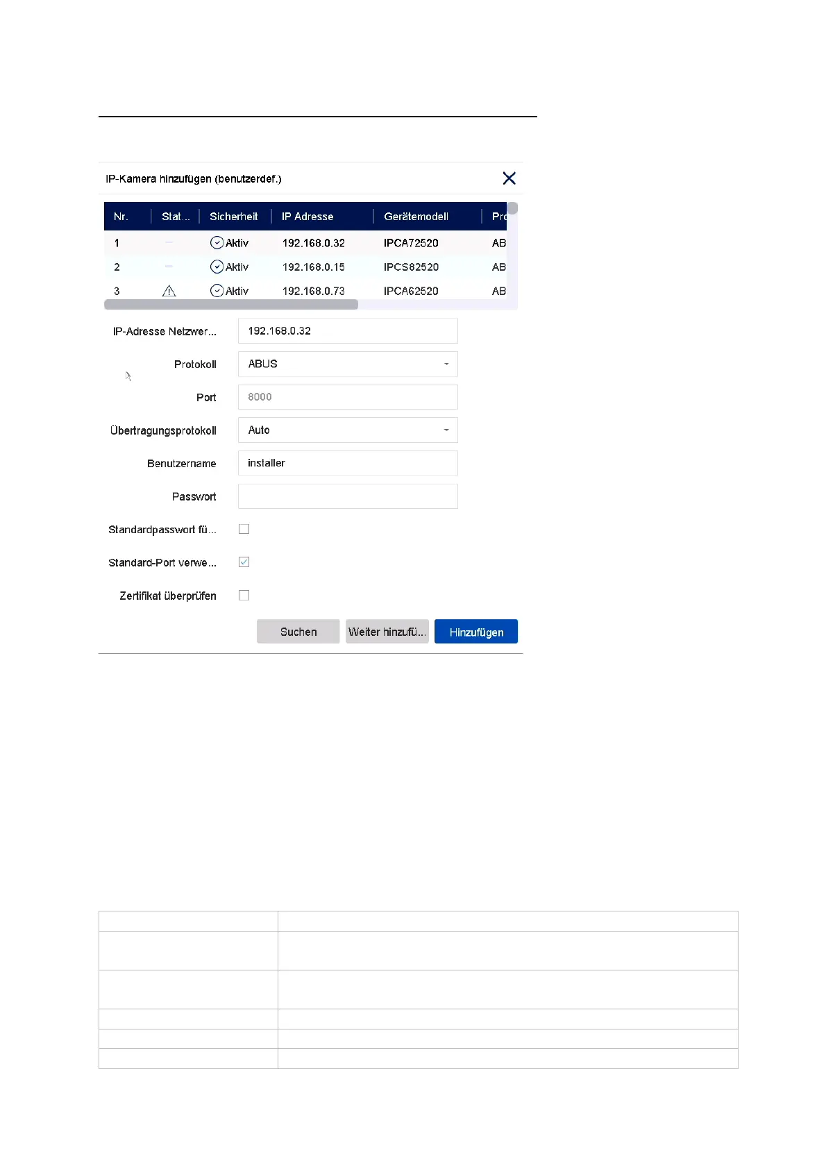 Hier können Sie manuell Netzwerkkameras durch Eingabe von IP-Adresse, Protokoll,