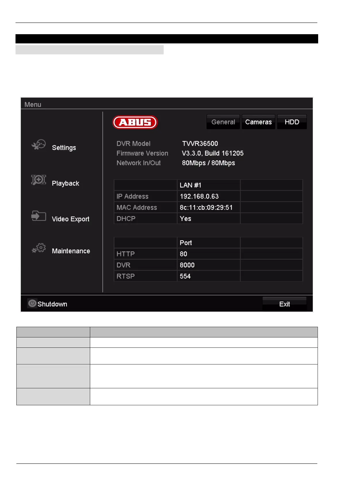 Settings Leads to the Configuration, Camera, Recording, HDD and Playback menus.