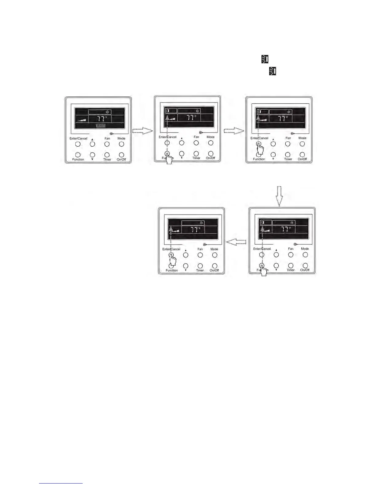 • SWING ON: Press function to activate swinging of louvers. Press ENTER/CANCEL when the icon begins to blink to confirm