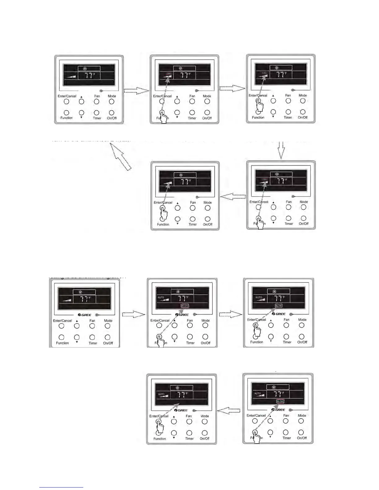 In the Cooling or Dry mode, press Function till the unit enters the Blow setting status and then press Enter/Cancel to active this function.