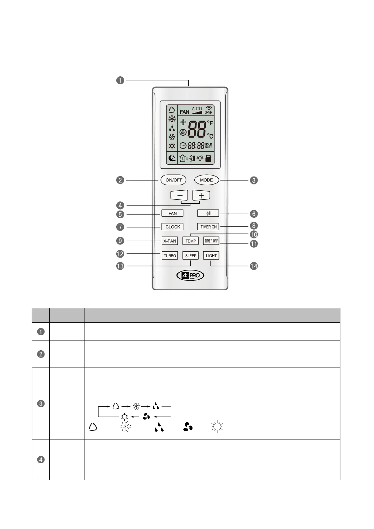 By pressing this button, Auto, Cool, Dry, Fan, Heat mode can be selected circularly. Auto