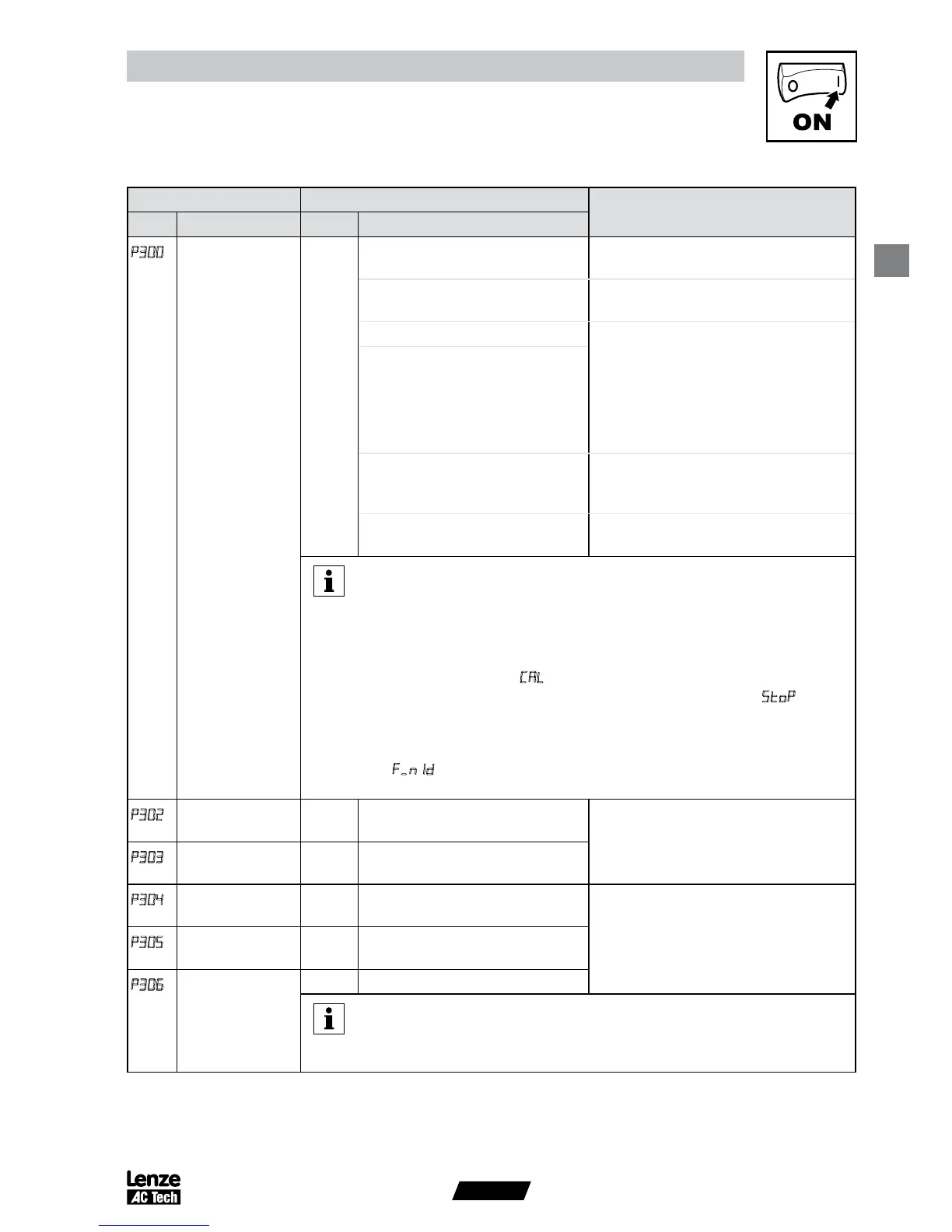 - Set P302...P306 according to motor nameplate