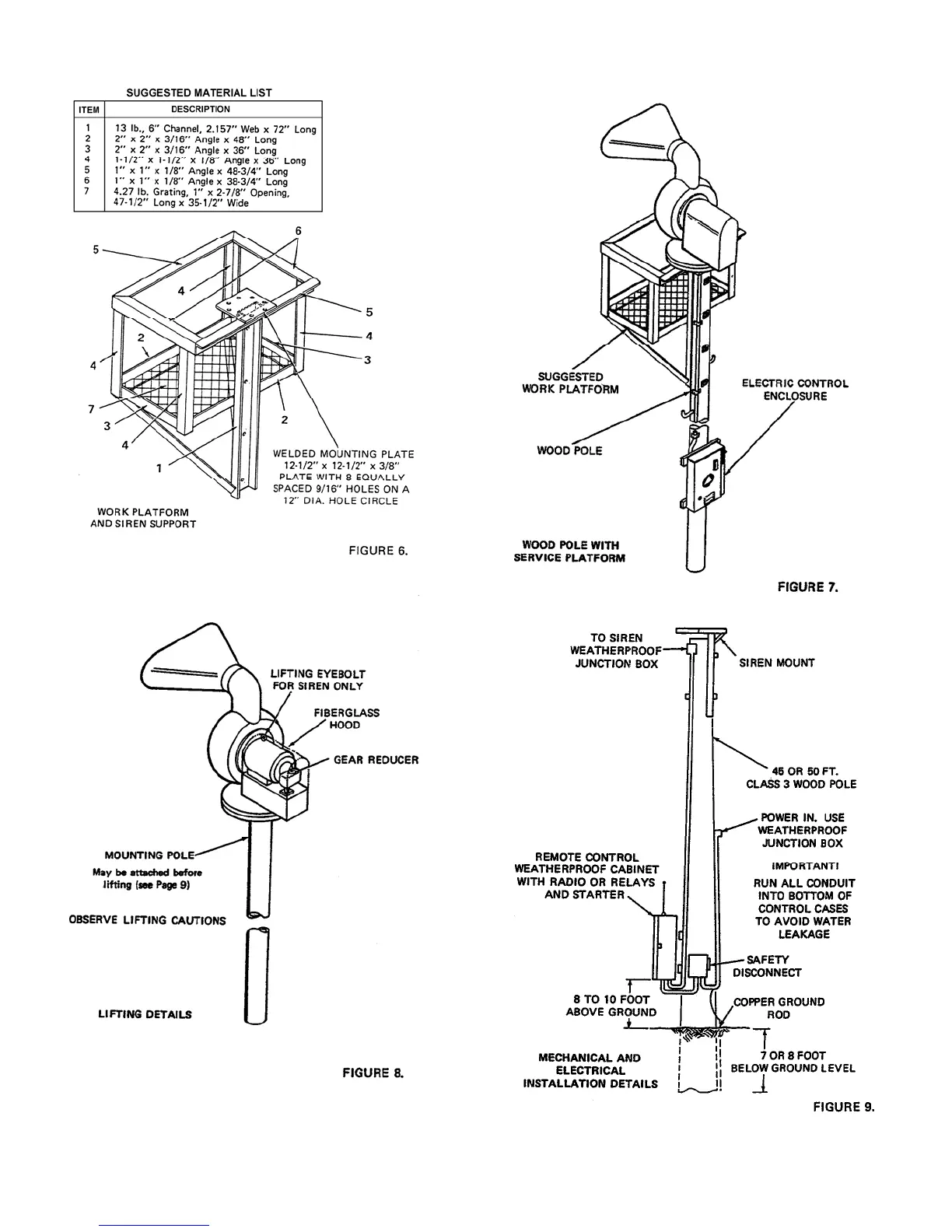 ACA ALLERTOR 125 - WORK PLATFORM AND SIREN SUPPORT; WOOD POLE WITH SERVICE PLATFORM; LIFTING DETAILS; MECHANICAL AND ELECTRICAL INSTALLATION DETAILS