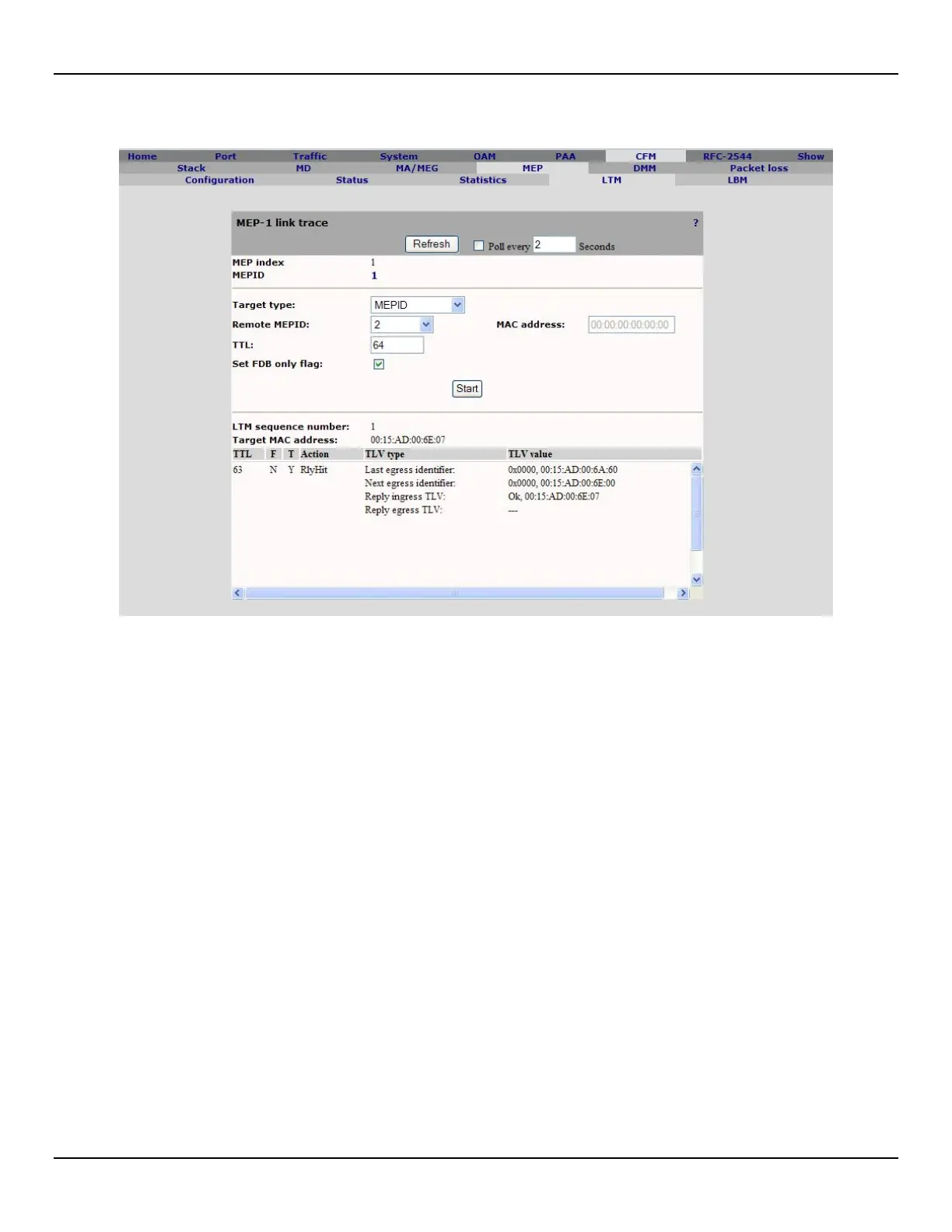 8. Open the CFM > LTM and click on the MEPID, then click Start to start the link trace.