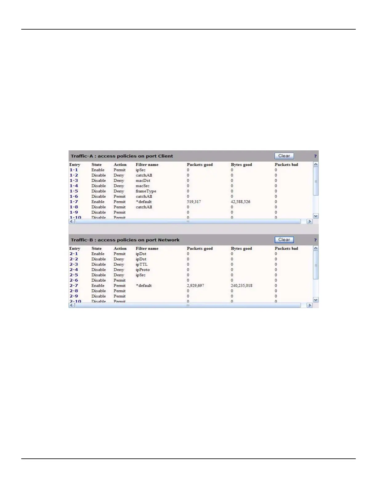 • Packets good: The number of good packets that matched the policy. A good packet is an error-free frame that has