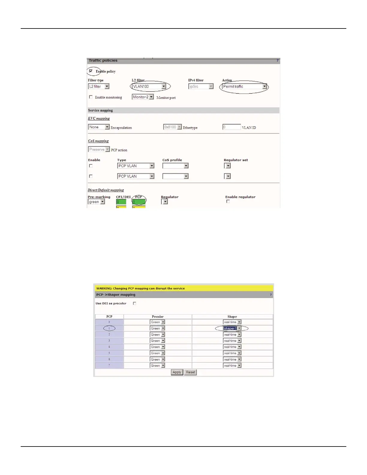 The PCP shaper mapping allows user to map the traffic to a shaper's queue based on the PCP and CFI/DEI fields in the