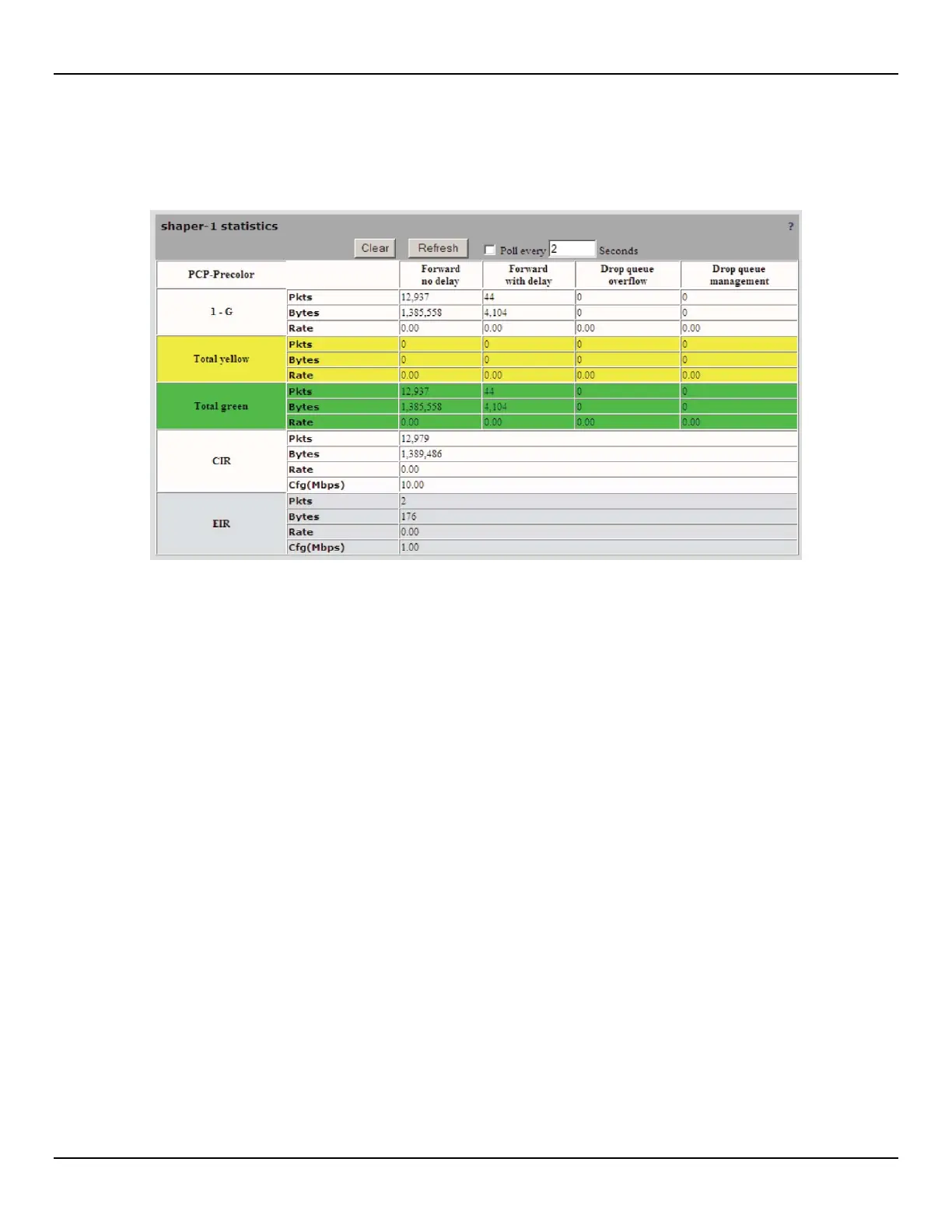 • Total yellow: This is the total number of yellow packets/bytes and rate forwarded by this shaper.