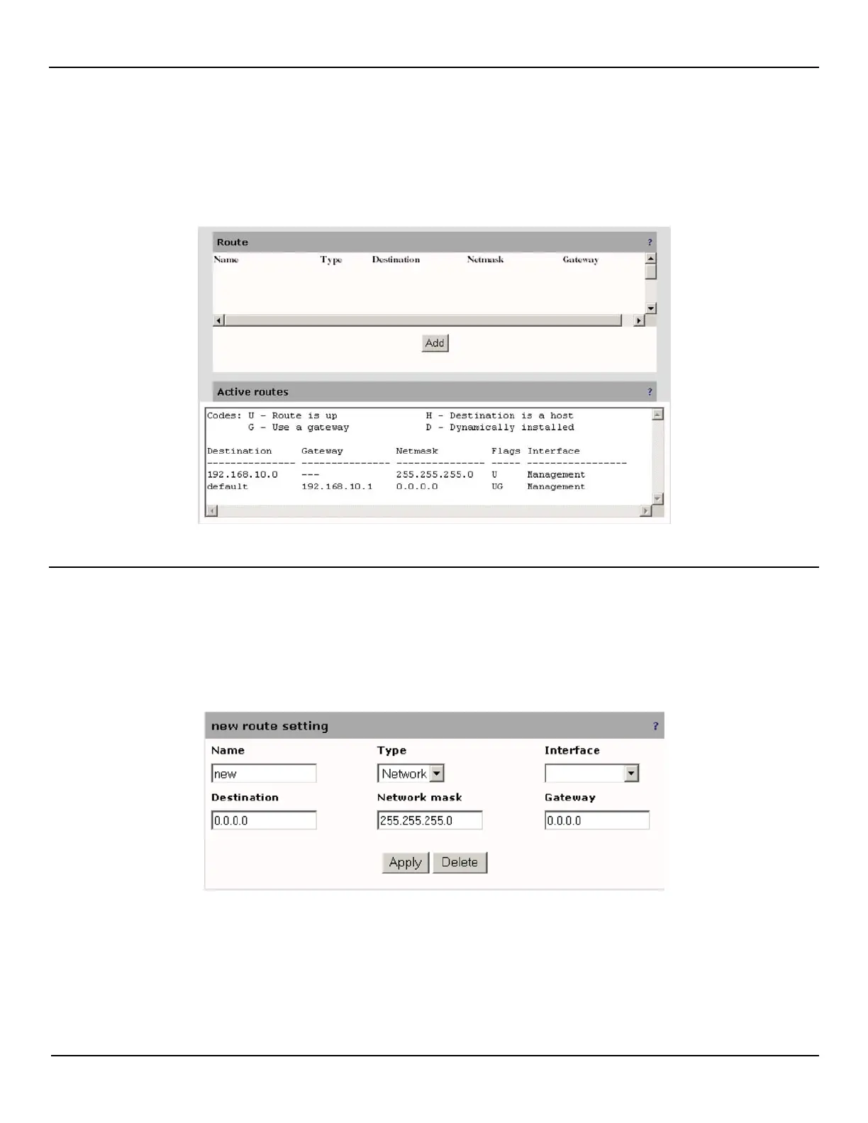 Select System > Interface to open the routes pages, which shows all active routes on the EtherNID. Initially, no routes are