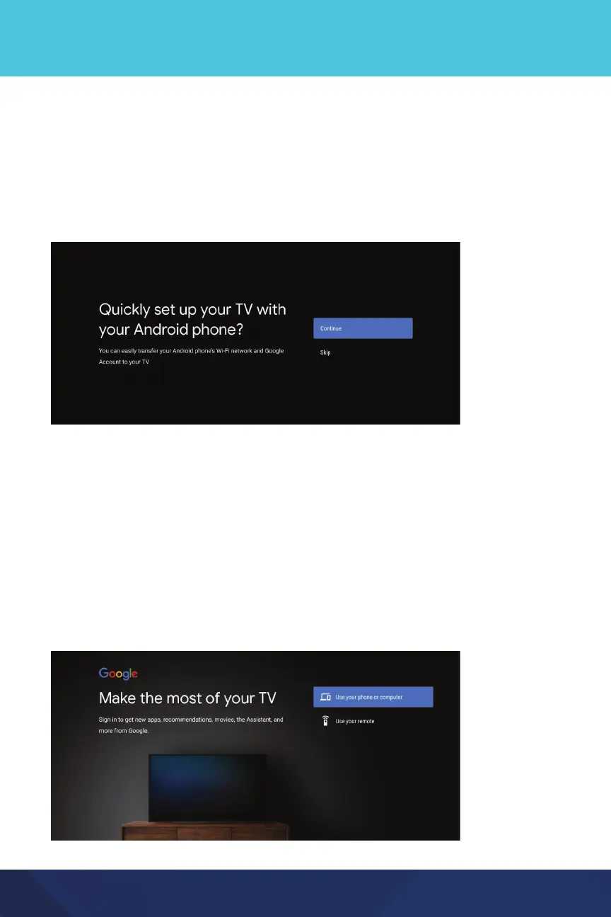 Wi-Fi network and Google Account to your TV. Select Continue, then follow
