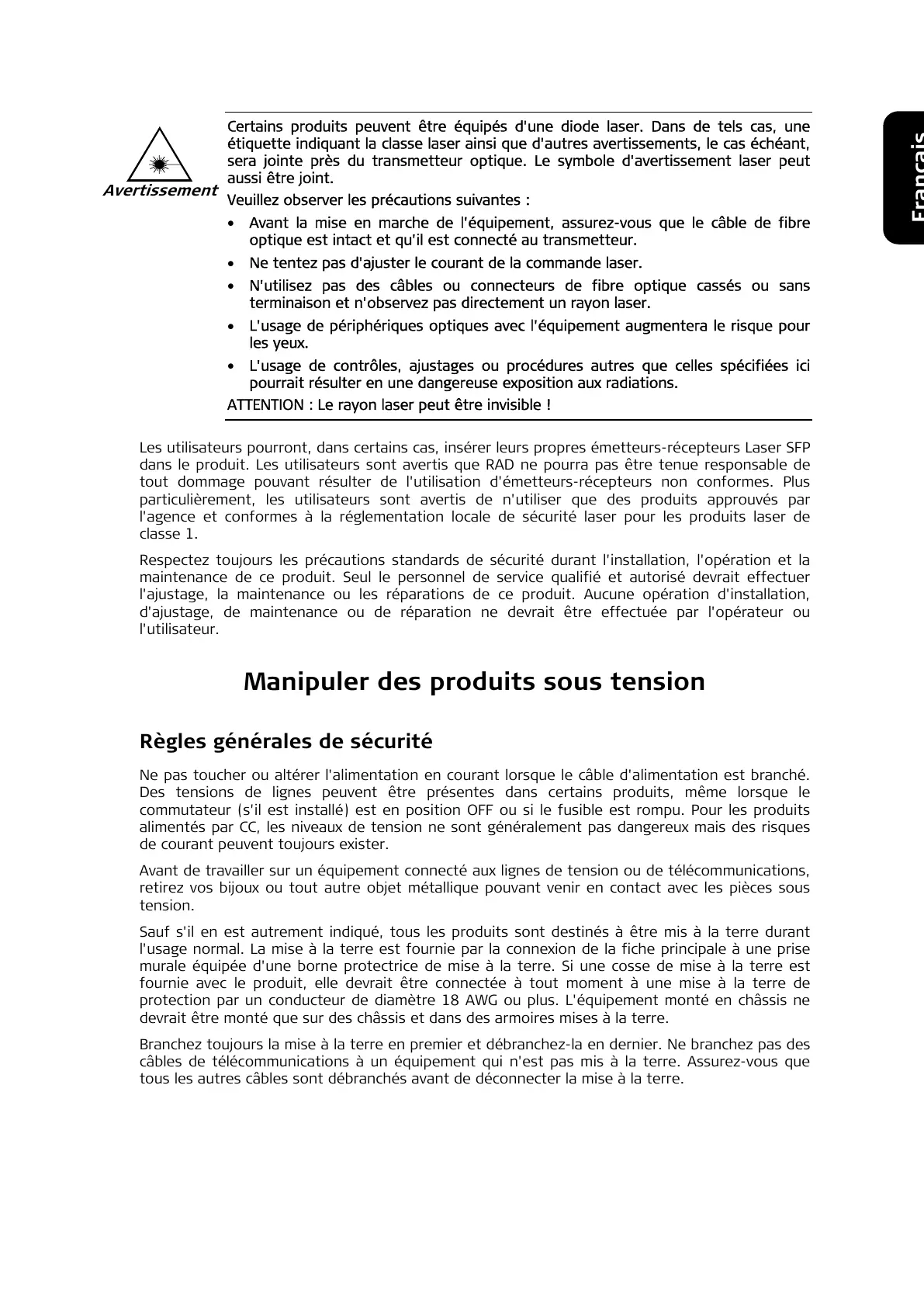 Avant de travailler sur un équipement connecté aux lignes de tension ou de télécommunications,