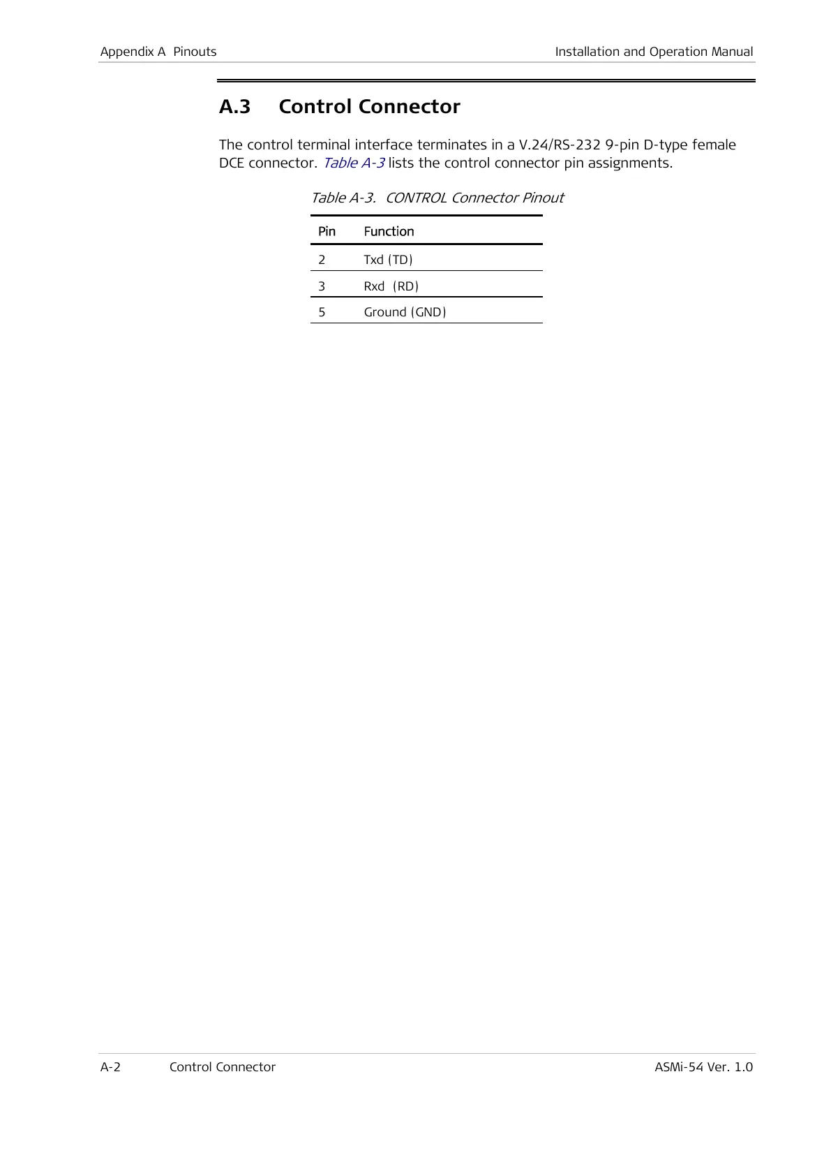 Table A-3. CONTROL Connector Pinout