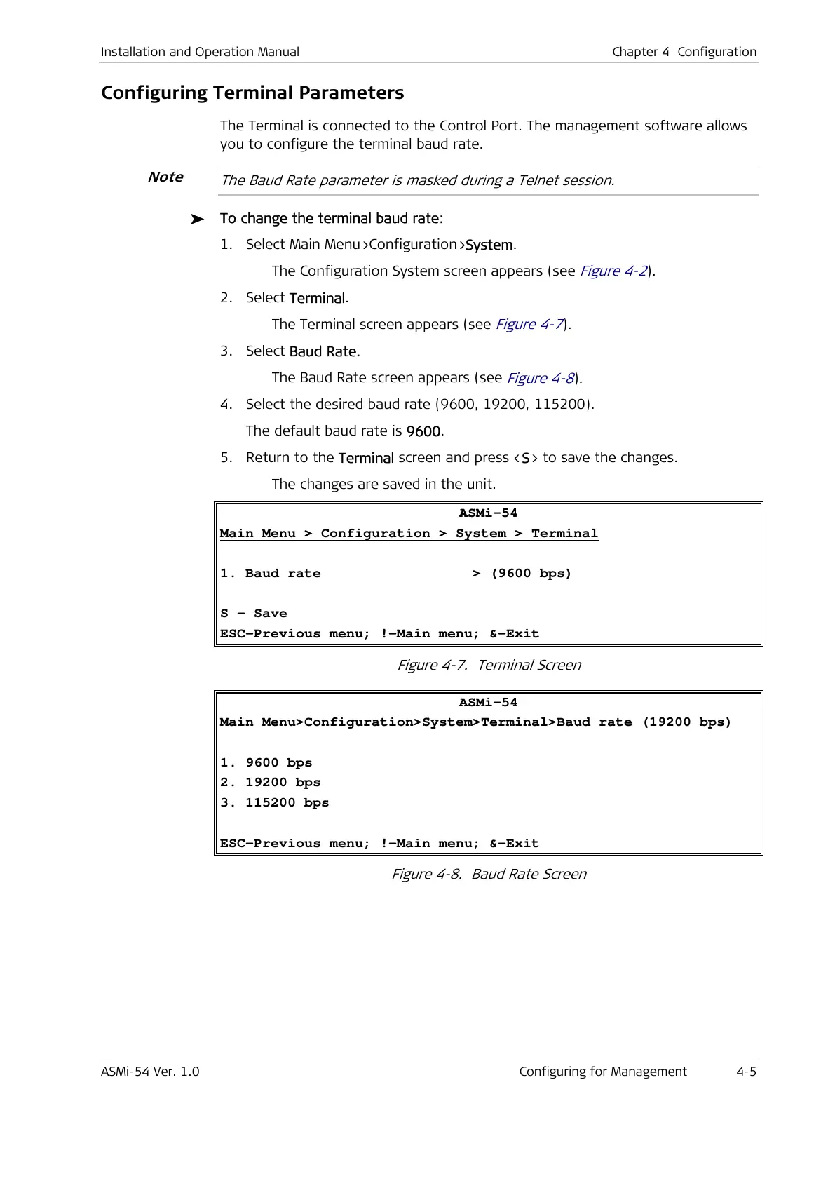 Main Menu>Configuration>System>Terminal>Baud rate (19200 bps)