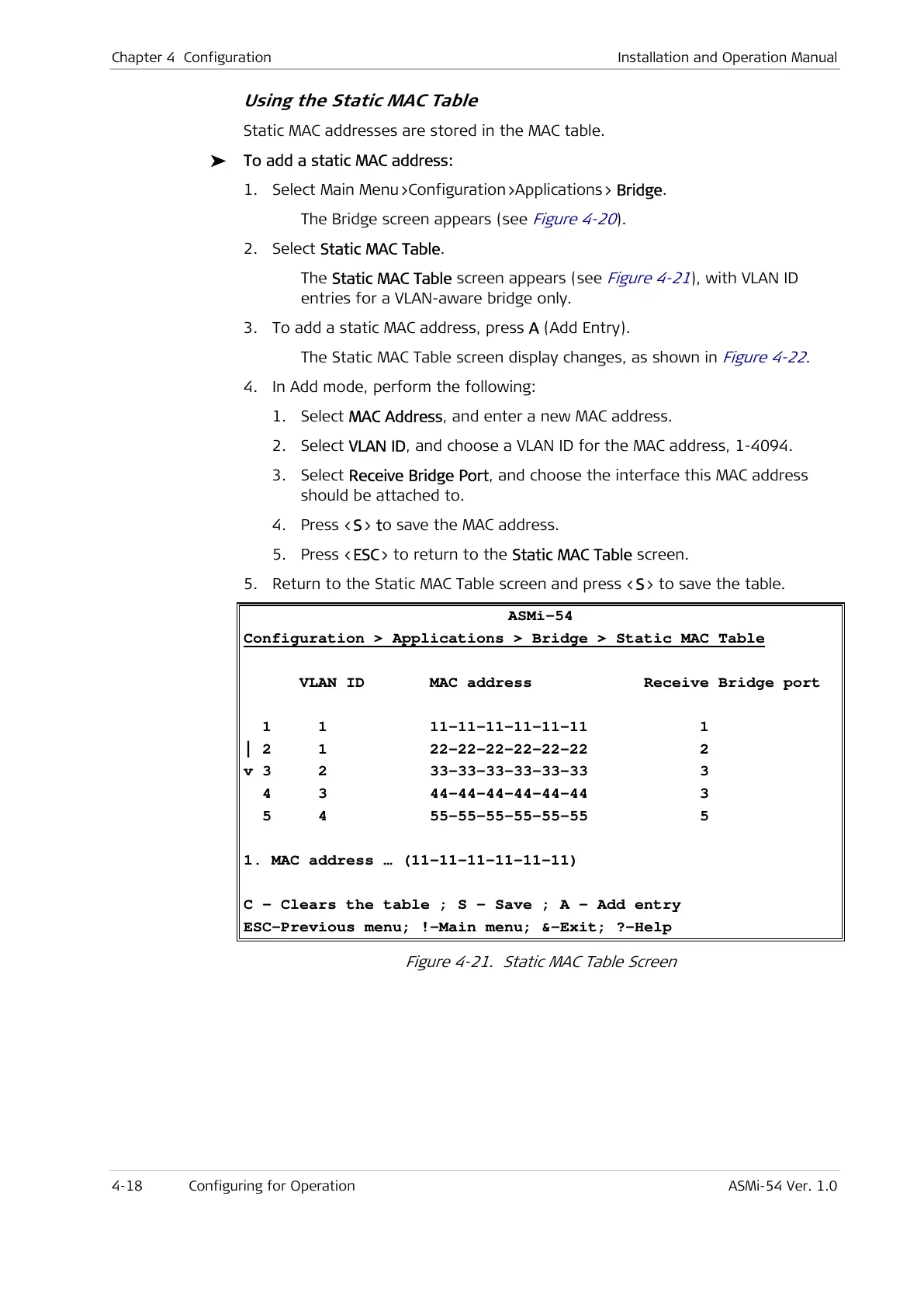 5. Return to the Static MAC Table screen and press <S> to save the table.