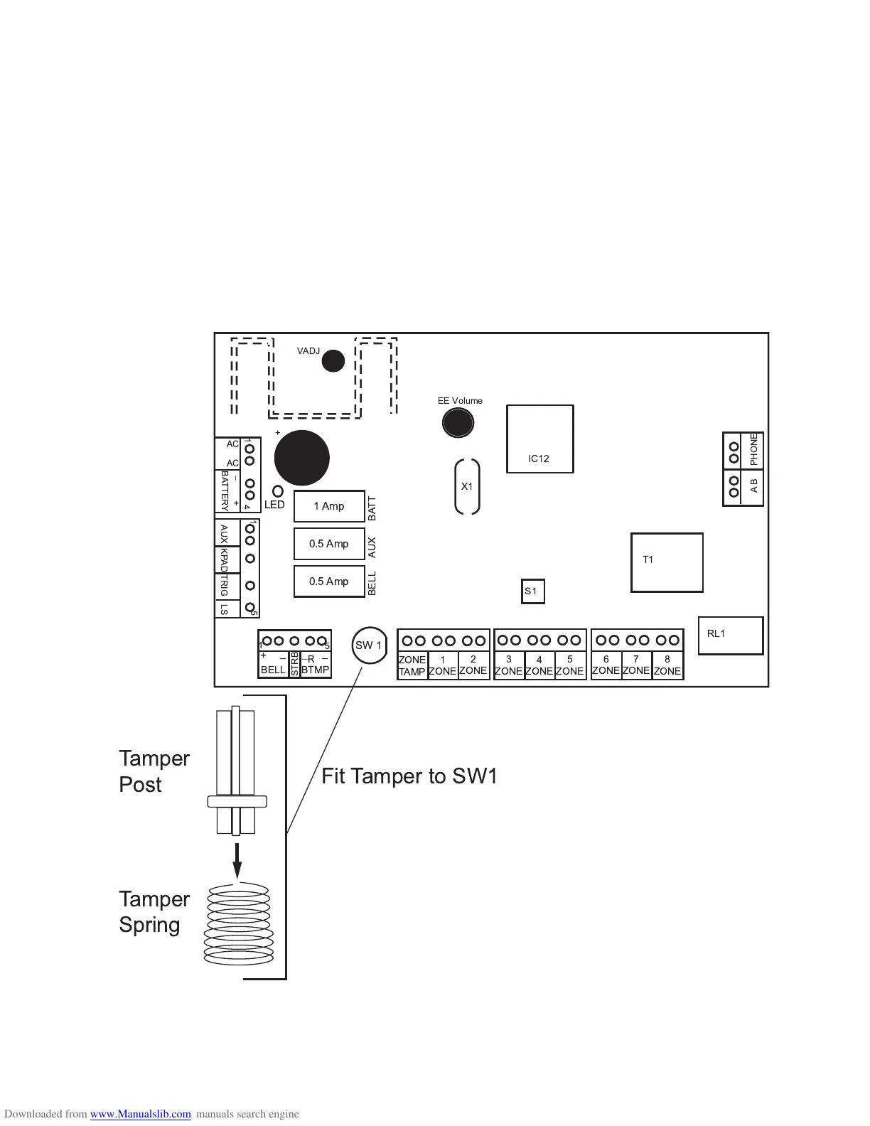 the opposite end of the spring to the Tamper Switch (SW1) on the PCB (see below).
