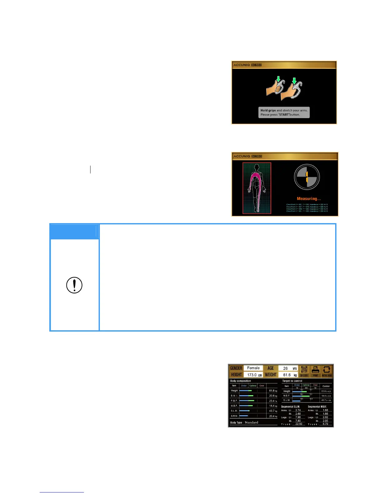 - To measure again, hold the handle electrodes and press start buttons with