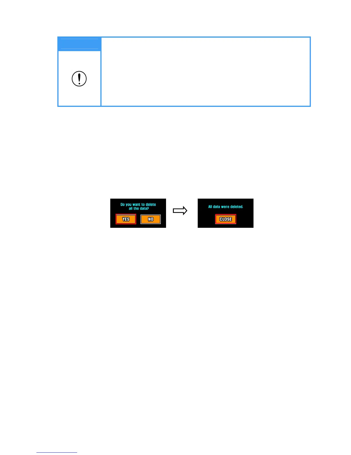 When deleting the data, the message ‘All data were deleted’ will appear. Press ‘Close’ to