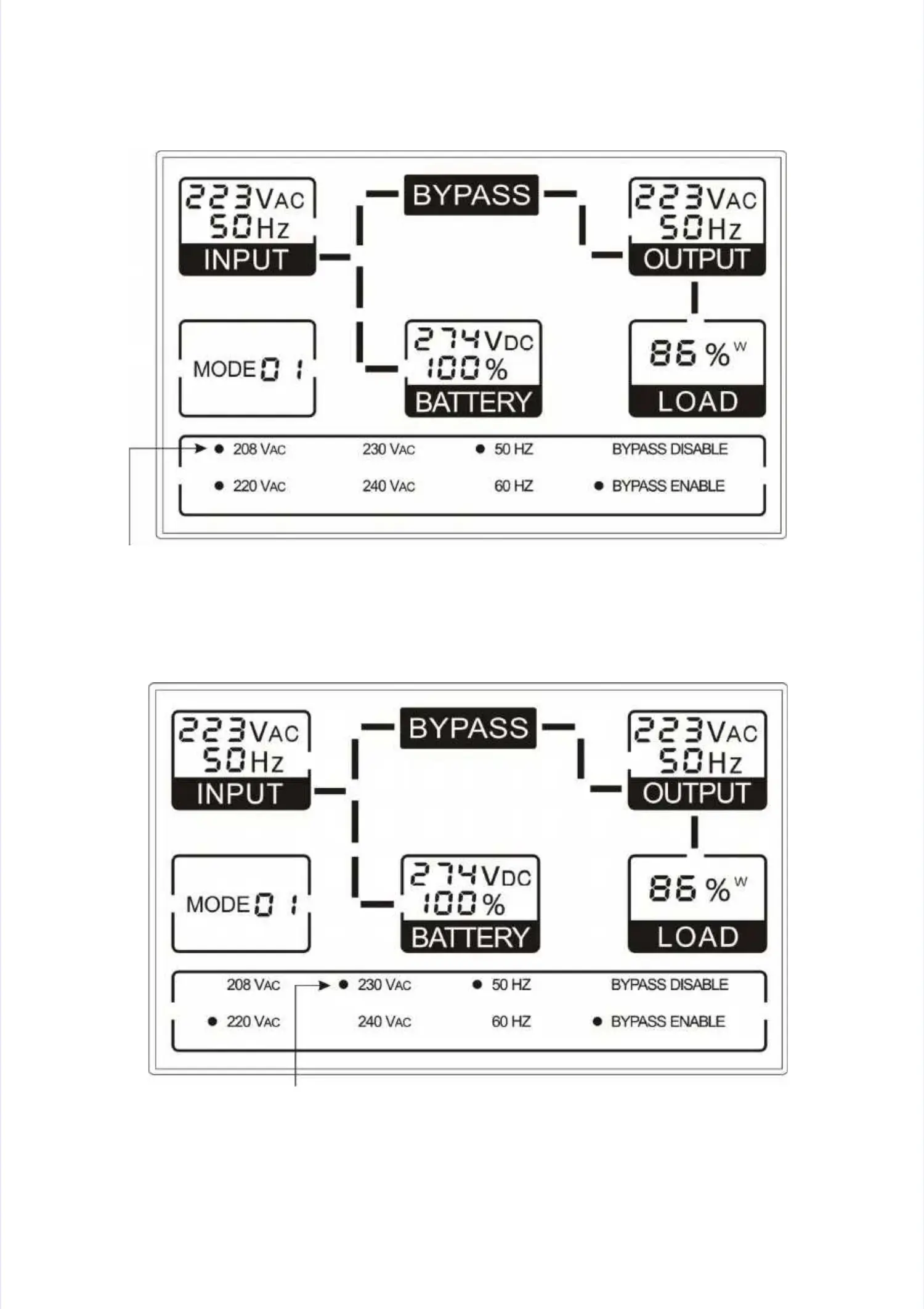 “208Vac” after pressing the Select button.“208Vac” after pressing the Select button.