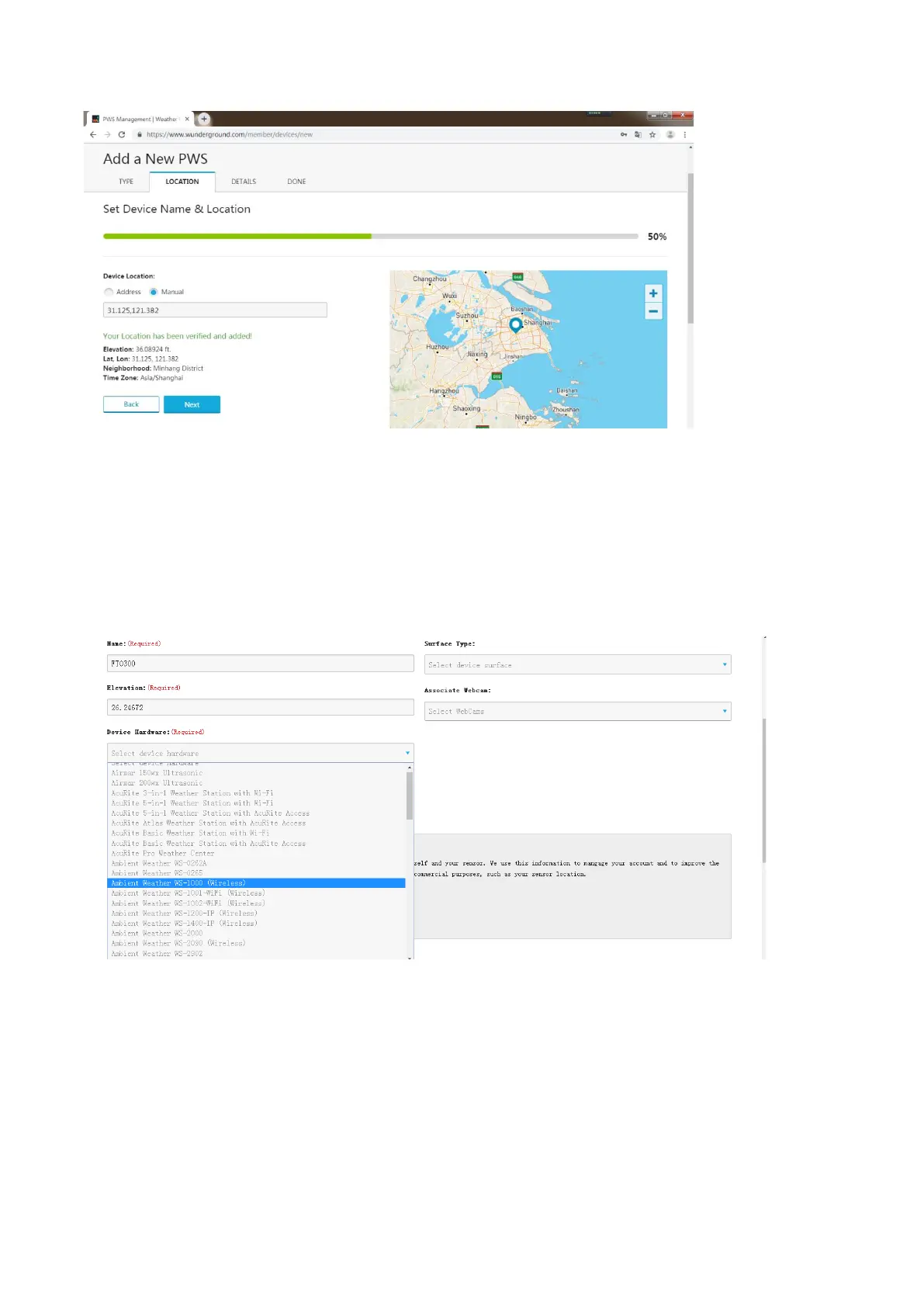 Note: You can select any Wi-Fi weather station model in the Device Hardware box; we recommend ‘AcuRite