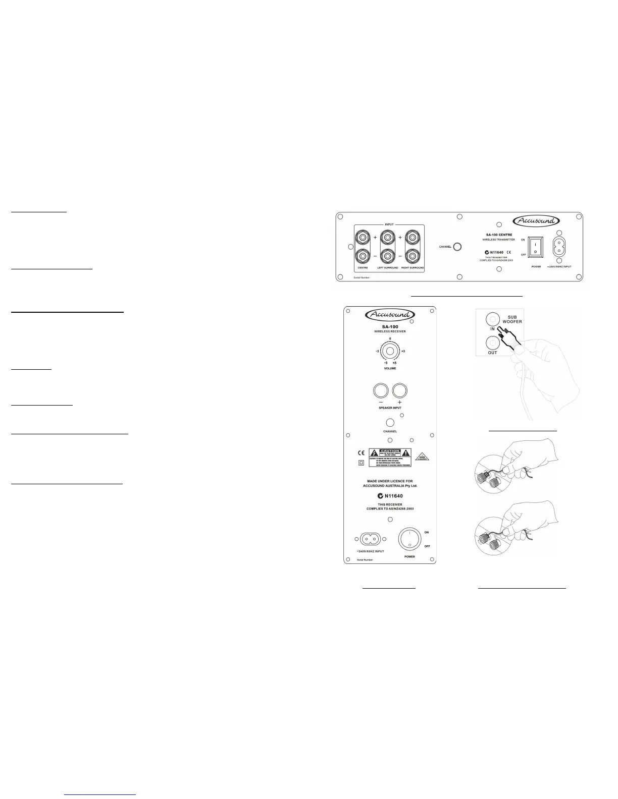 the centre speaker terminals to the left and right inputs and centre input on the transmitter. Please ensure