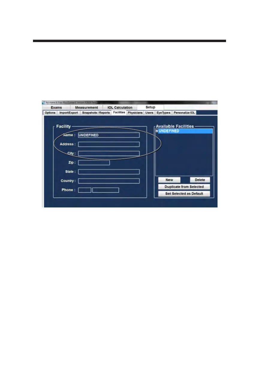 Accutome A-Scan Plus Connect - Figure 5-30 Facility Information Being Entered