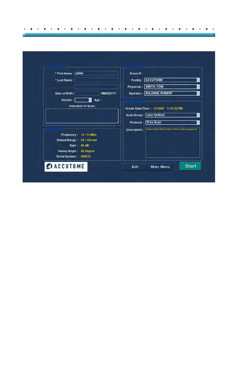 Accutome B-Scan Plus - Figure 74 Initial Exam Screen with Patient Name