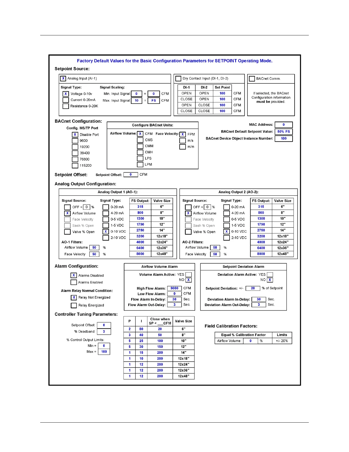 APPENDIX C: FACTORY DEFAULT VALUES FOR SETPOINT MODE