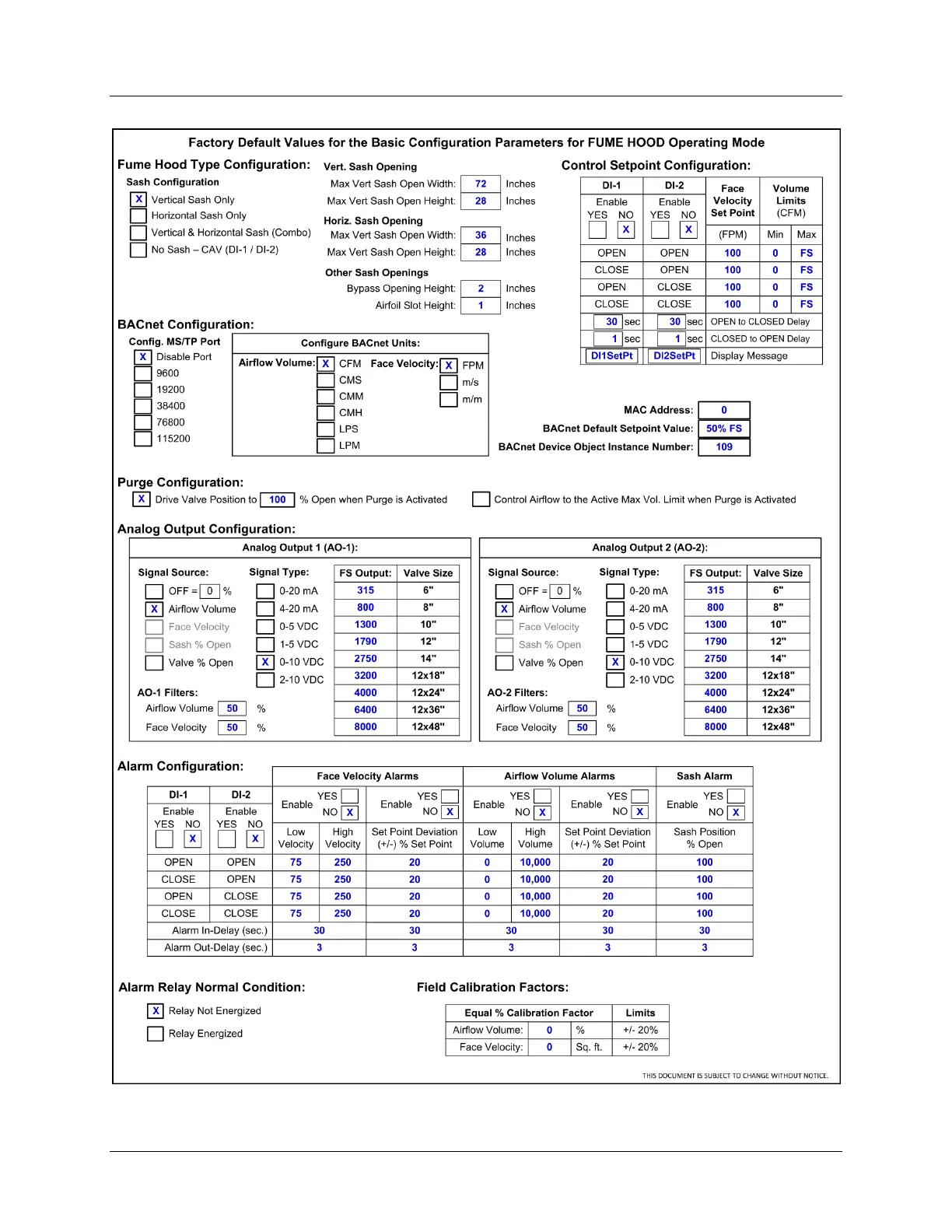 APPENDIX D: FACTORY DEFAULT VALUES FOR FUMEHOOD MODE