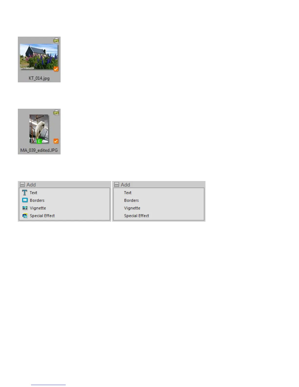 Quickly find your edited image. Now, whichever mode you're in you can identify the edited images by E icon. Or you can group, sort,