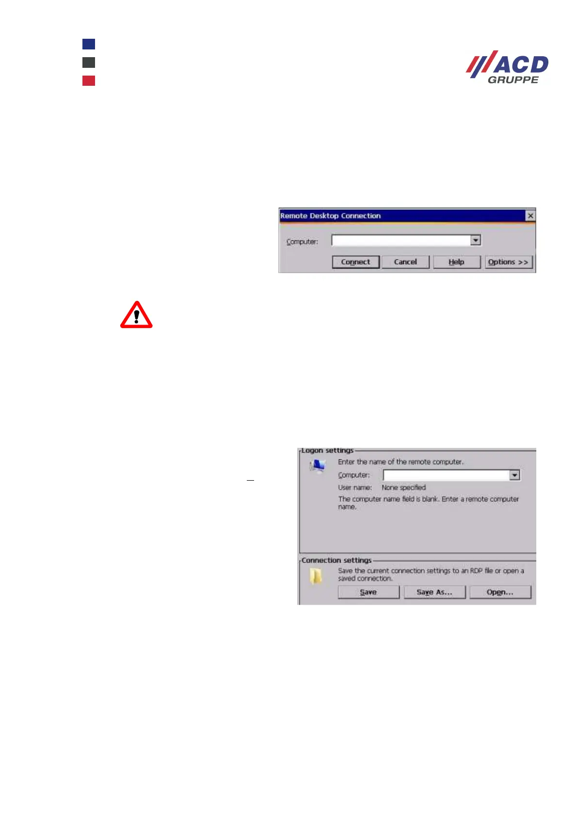 If the name or IP address of the terminal server is entered and the Connect option is activated to set up the