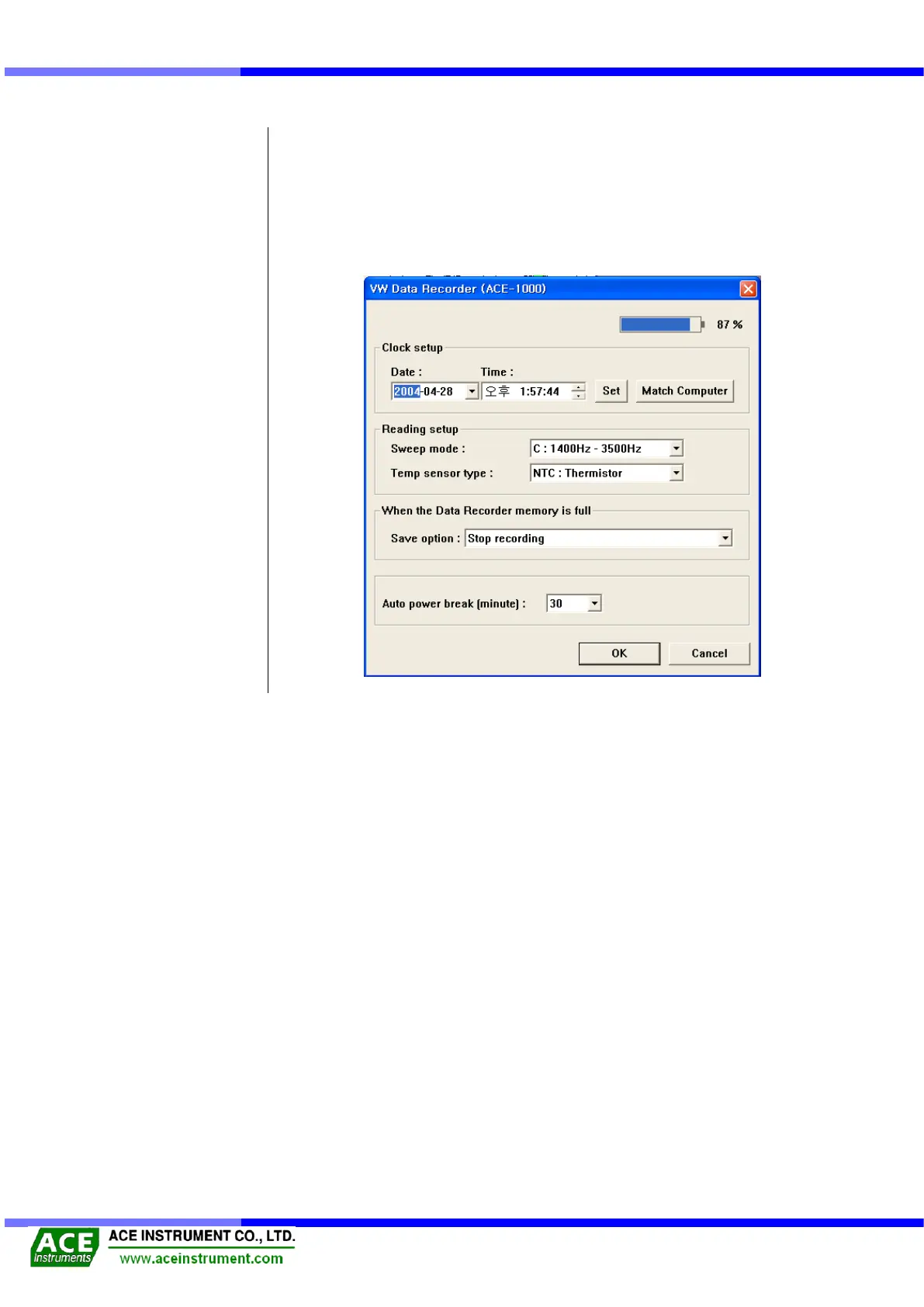 battery of data recorder and set an option of Clock setup, Reading setup, Save option, Auto