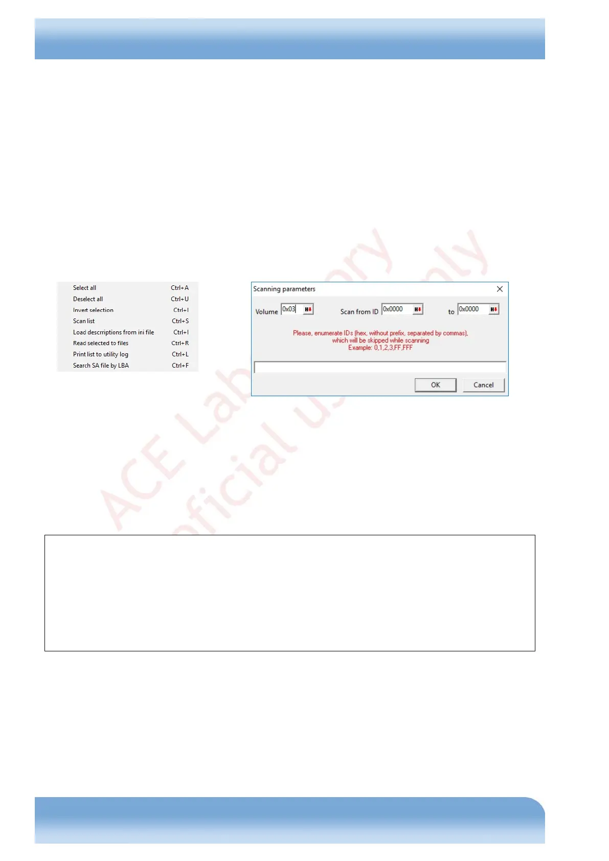 range for scanning as well as the list of File ID to skip (when information about certain FW files is requested, a LED: