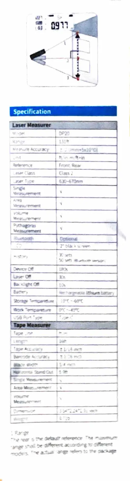 Acegmet DP20 - Product Specifications; Laser Measurer Specifications; Tape Measurer Specifications