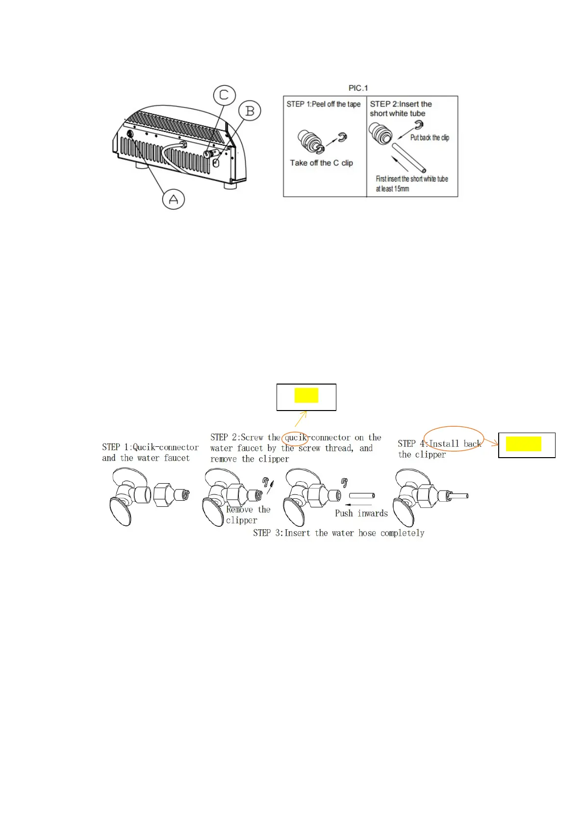 quick connector onto the faucet; then remove the clip from the water hose quick connector,