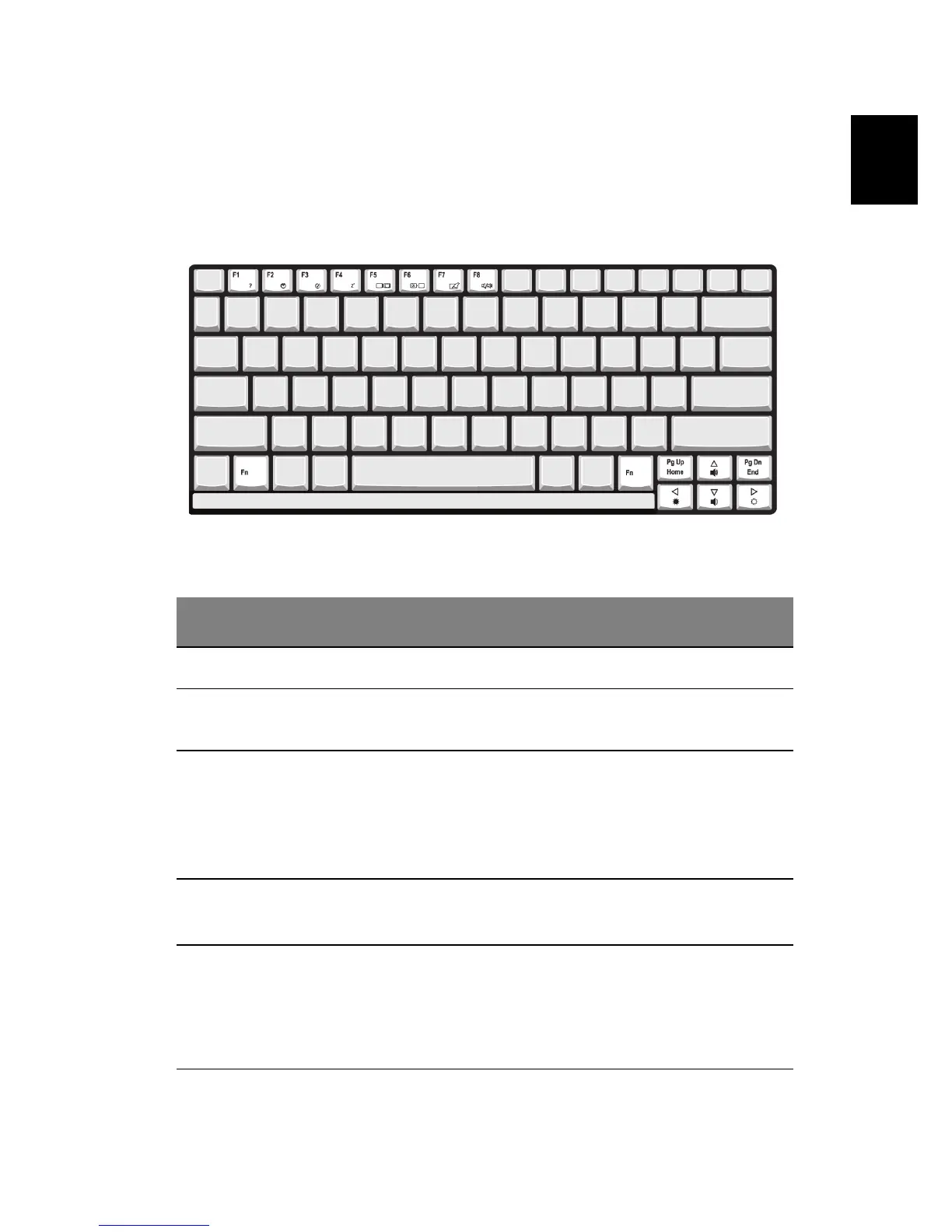 Fn + F1 Hot key help Displays help on hot keys.