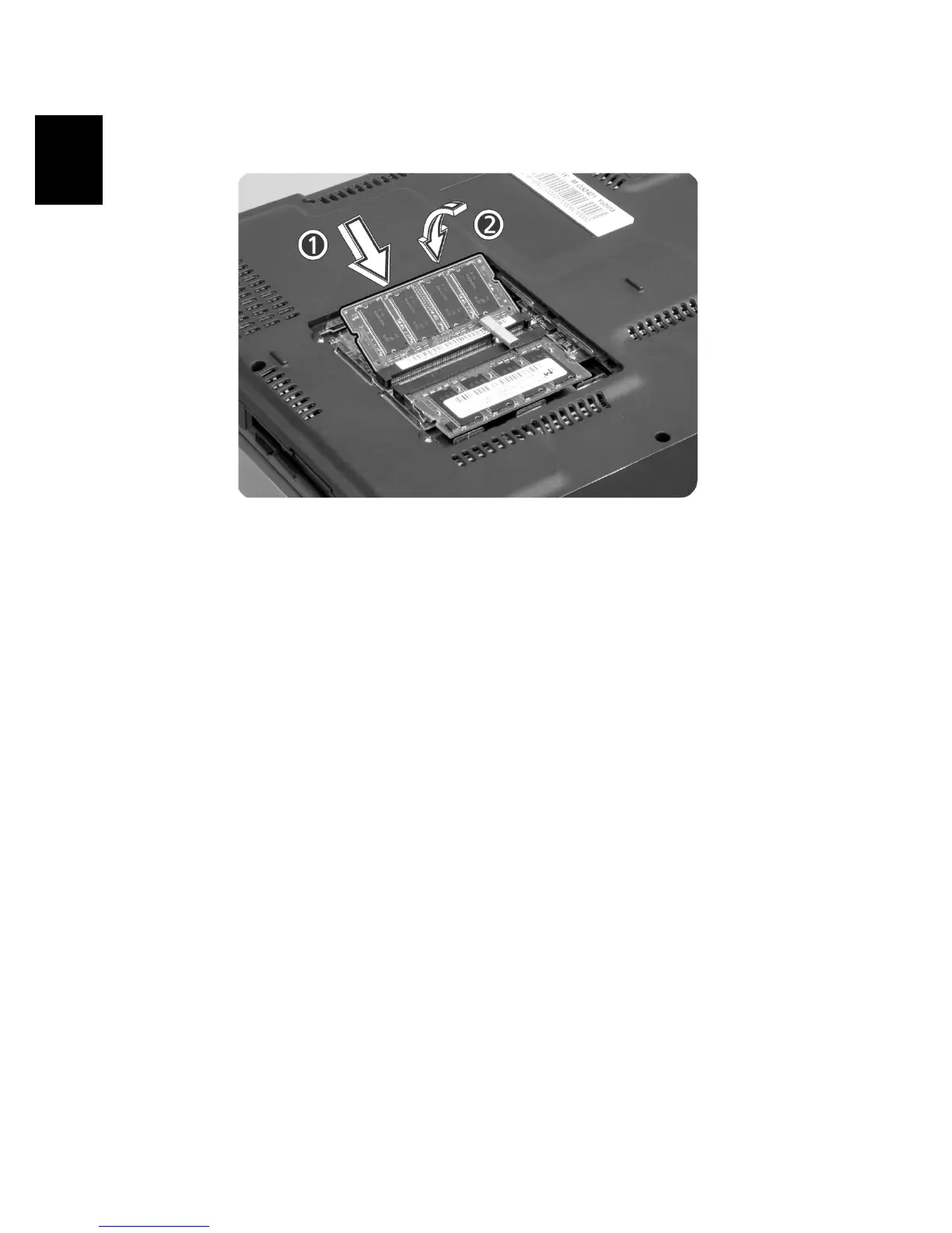 3 Insert the memory module diagonally into the slot (1), then gently