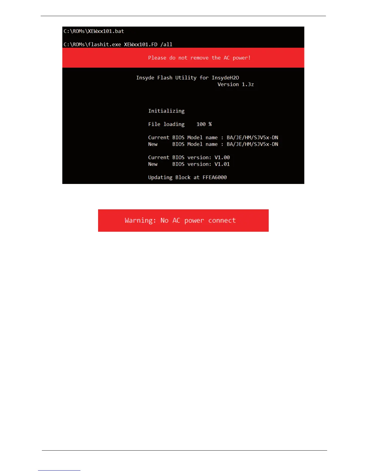 4. In flash BIOS, the message Please do not remove AC Power Source displays.
