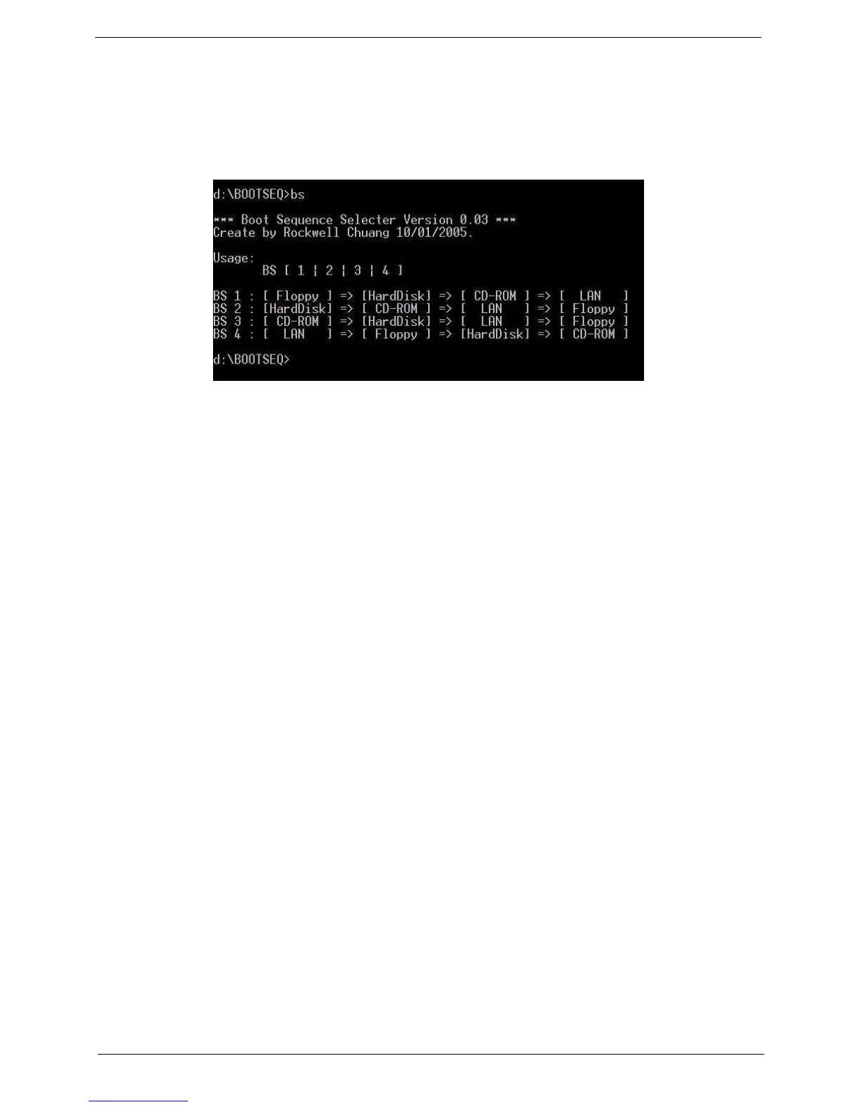 3. Select the desired boot sequence by entering the corresponding sequence. For example, enter BS 2 to