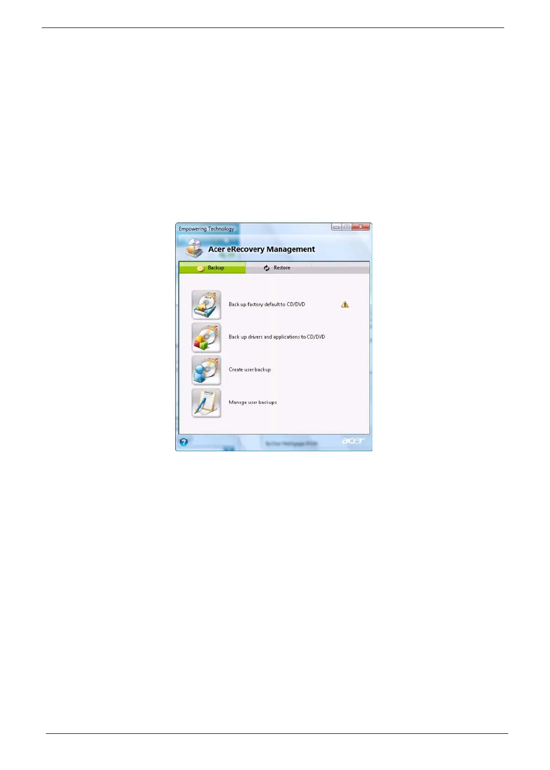NOTE: If your computer did not come with a Recovery CD or System CD, please use Acer eRecovery