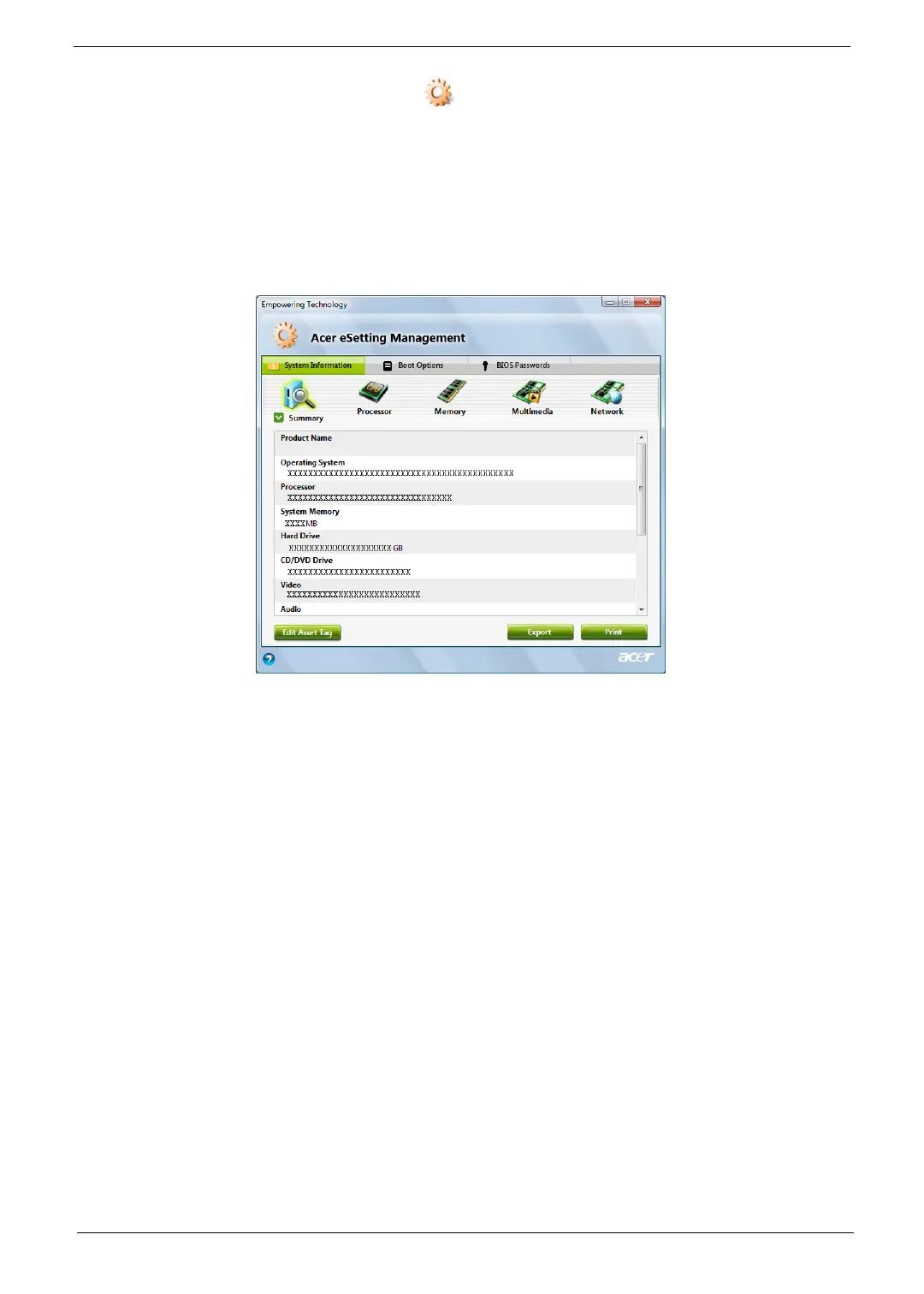 Acer eSettings Management allows you to inspect hardware specifications, set BIOS passwords and modify