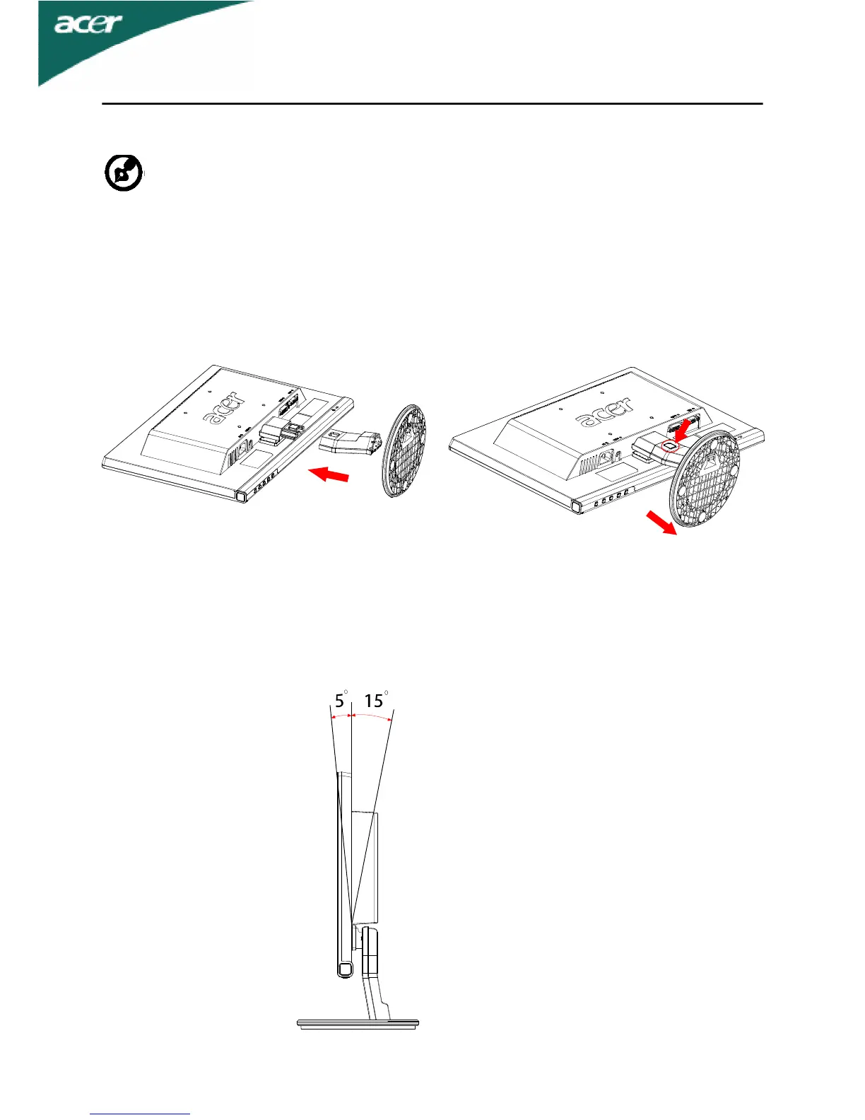The monitor can be adjusted to 15 degrees up or 5 degrees down as indi-
