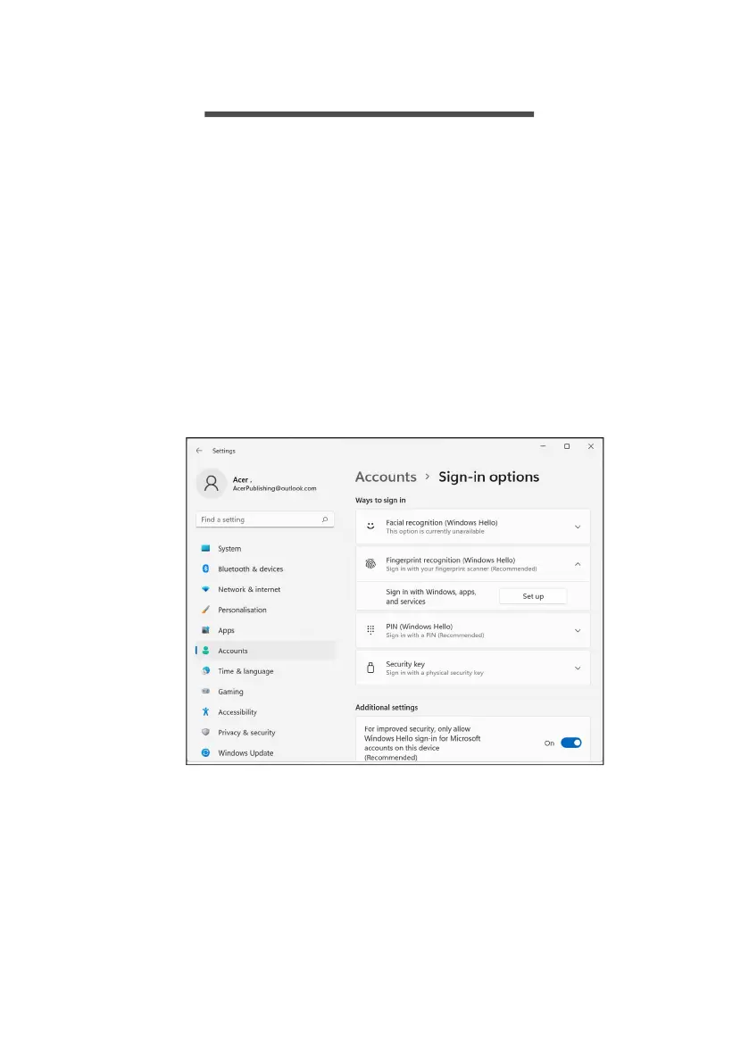 1. In Fingerprint recognition (Windows Hello), select Set up to