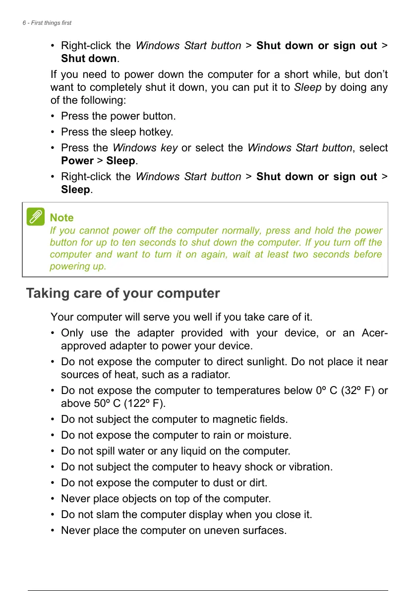• Do not expose the computer to temperatures below 0º C (32º F) or