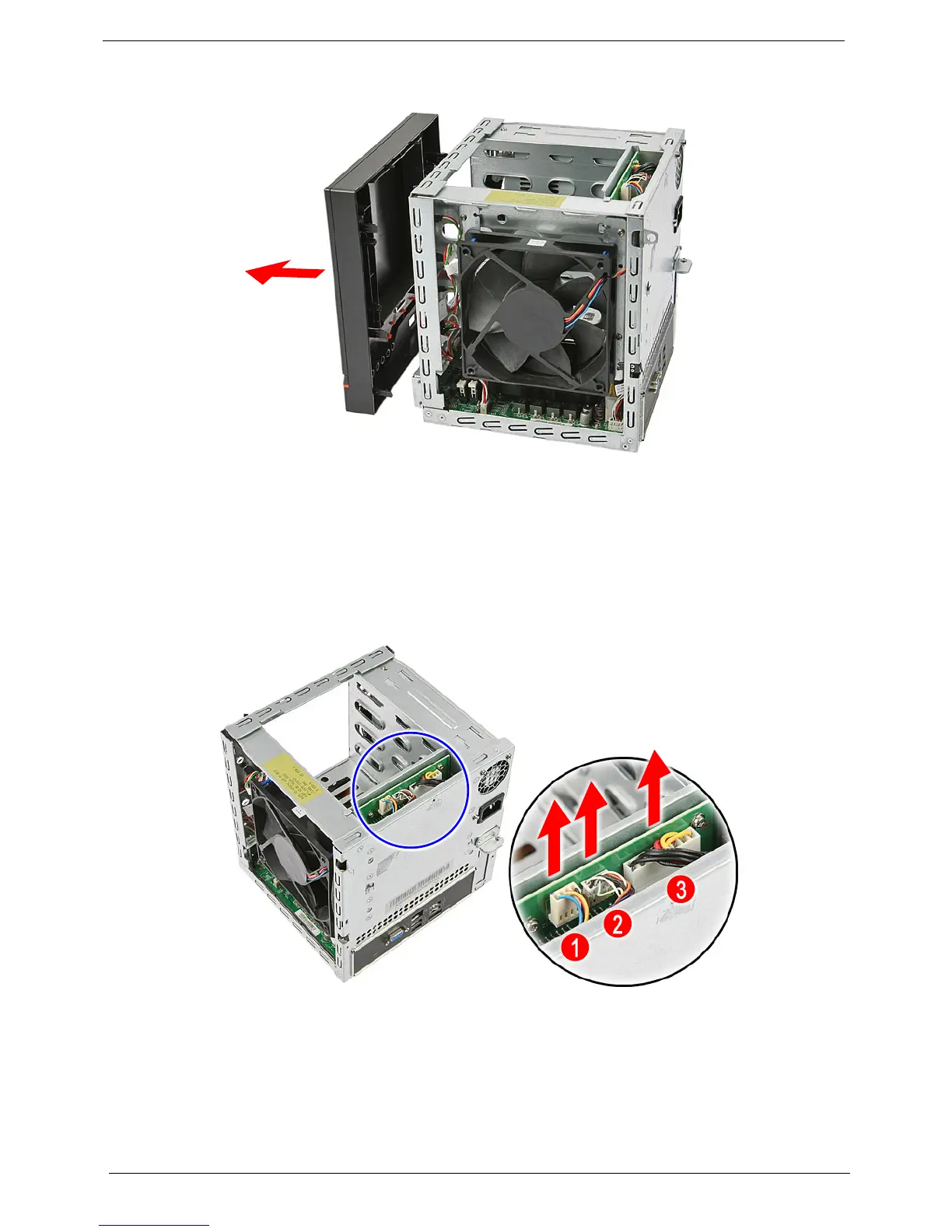 3. Disconnect the fan (1), LED (2), and power (3) cables from their backplane board connectors.