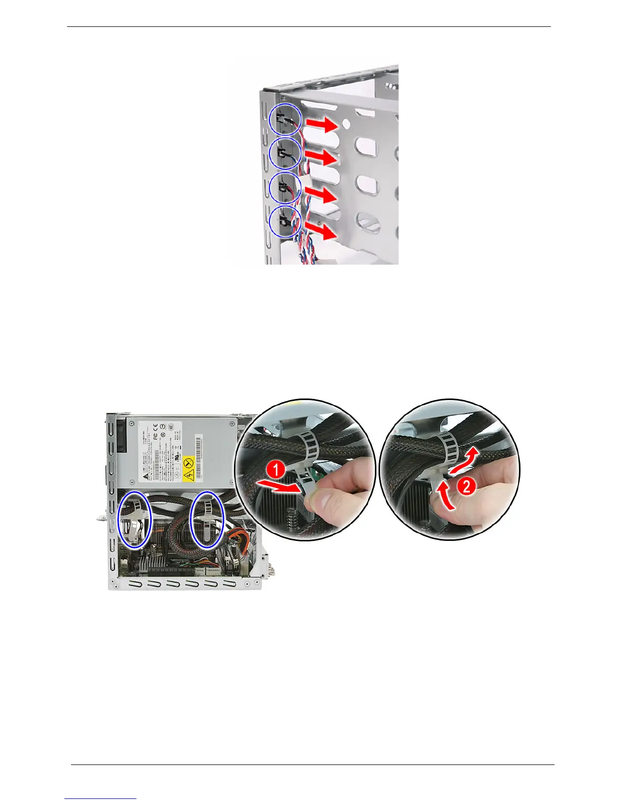 4. Pull the cable tie to dislodge from the locking tab (1). Push the cable tie completely through the guide (2)