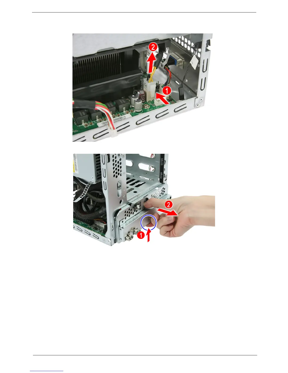 5. While pressing the tab (1) on the 4-pin power cable, pull the cable off (2) the mainboard connector