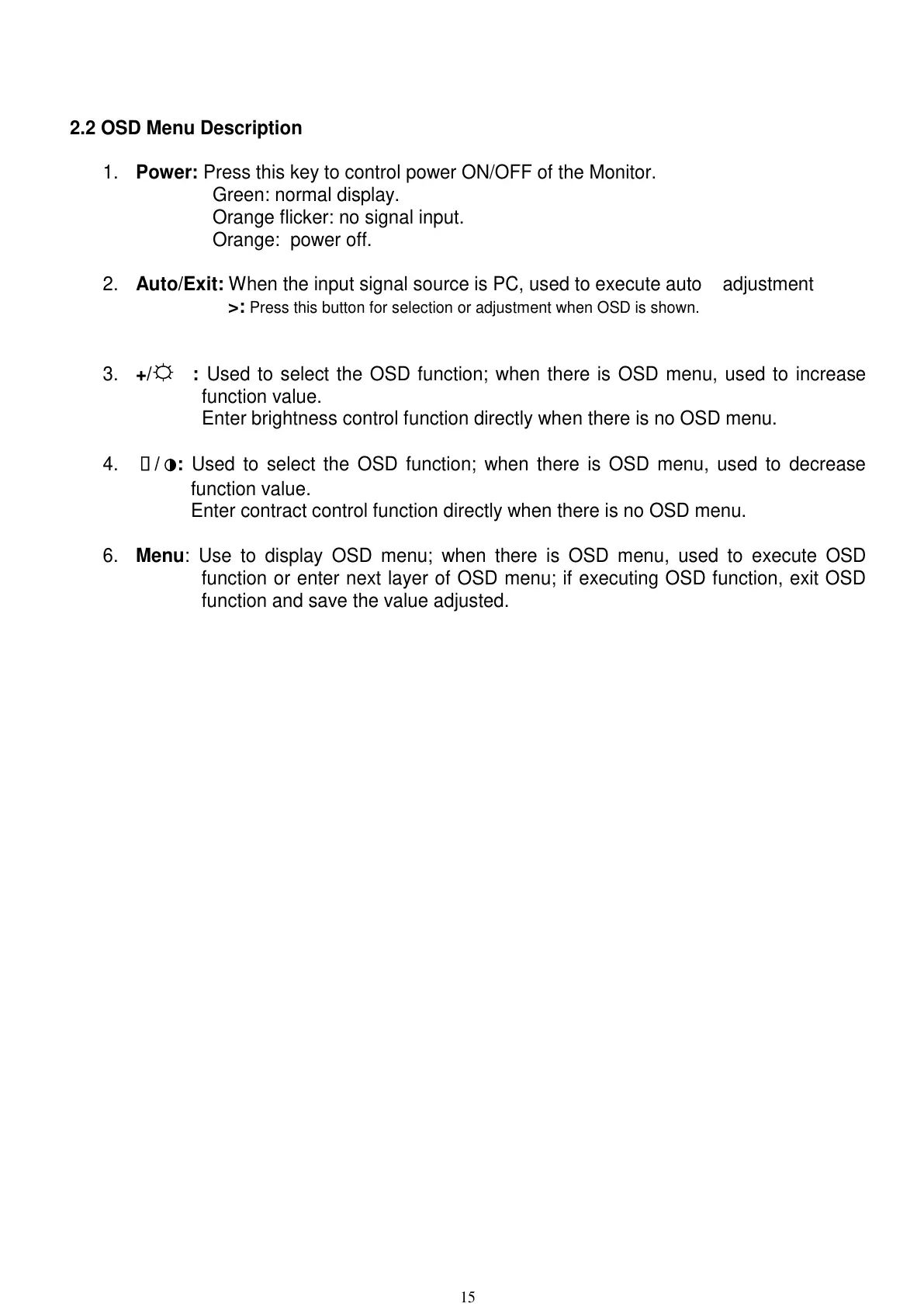 3. +/ : Used to select the OSD function; when there is OSD menu, used to increase
